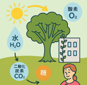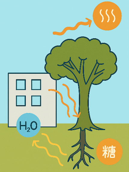 樹木は、水を分解して酸素を放出し、二酸化炭素から糖を合成する光合成を行っていますが、樹木が根から吸収して葉から蒸散させる水の量は光合成で使う水の量の100倍以上になることもあります。