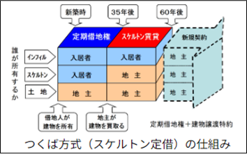 つくば方式とは、正式には「スケルトン定借」のことで、小林秀樹先生(経歴は後述)が定期借地権を利用して提唱されたものです。