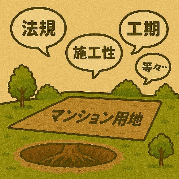 従って、マンション(建築物)は理想形を追う仕事ではなく、前述のとおり、安全対策を含めた法規、構造、施工性、コスト、工期、維持管理、近隣の承諾といった条件の中で、最もバランスの取れた形(言い換えれば妥協の産物)を探すこととなり、出来上がった建物を外から見て不合理に見える部分にも、必ず理由があるということになります。