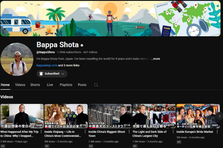 「9月20日、登録者数135万人の人気旅系YouTuber・Bappa Shotaが自身のYouTubeチャンネルを更新。2カ月の沈黙を破り、現在の状況を報告した。 2カ月前、『中国ウイグル自治区と強制収容所の実態がとんでもなかった』という動画を最後に、しばらく沈黙。SNSもストップし、音信不通となっていました。 最後の動画内容が強烈だっただけに、心配の声が集まっていたのですが、先日、新しく動画をアップし、『みなさん本当にご心配おかけして申し訳ないです。現在は日本に帰国しておりまして、無事に旅を続けております』と近況を明かしました」(芸能記者)」 という記事です。140万人のフォロワーを誇るこの人気ユーチューバーの若者は、Bappa Shotaチャンネルを通して、世界各地を単身で訪れてその地域にかかわる社会的な問題や文化の紹介をしています。沢山ある動画の一つ一つが充実してよくできていまして、興味深くとても勉強になるので以前からよく拝見していました。