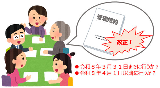 そこで、今後、各マンションにおいて管理規約を改正するに当たっては、規約の改正を決議する総会の招集手続きを令和8年3月31日までに行うか、または令和8年4月1日以降に行うかにより、手続方法が変わることになります。