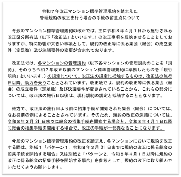 また、上記注意書きとは別に、「<重要>各マンションにおいて管理規約を改正する際の留意点」として、「今後、各マンションにおいて管理規約を改正するに当たっては、規約の改正を決議する総会の招集手続きを令和8年3月31日までに行うか、または令和8年4月1日以降に行うかにより、手続き方法が変わります。特に令和8年4月1日以降に総会の招集手続きを行う場合は、改正区分所有法の規定に則った総会の定足数・決議要件を満たす必要があります。詳しくは以下の留意事項をご確認ください。」として、上記各ケースでどのような対応が必要となるのかを記載した「令和7年改正マンション標準管理規約を踏まえた管理規約の改正を行う場合の手続の留意点について」が掲載されています(https://www.mlit.go.jp/jutakukentiku/house/content/001965195.pdf)。